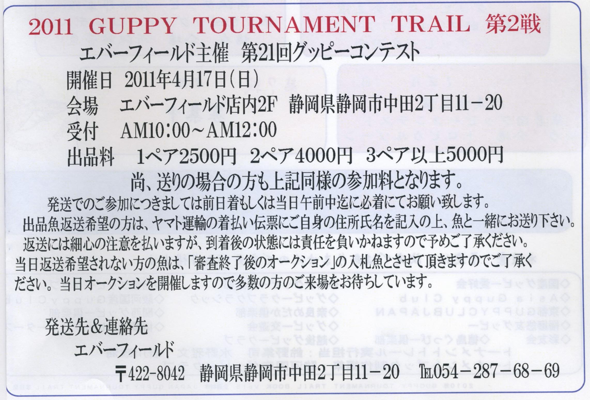 | 2011年12月11日 | 2011 GUPPYTOURNAMENT TRAIL 第9戦 | 第8回 グッピーコンテスト | 彩友会 | トロピカルゾーン(埼玉・越谷) | http://guppy.boy.jp/saiyukai/ |